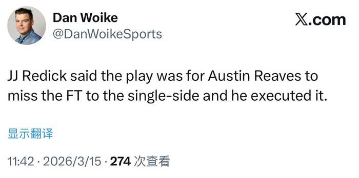 JJ·雷迪克表示,最后那个战术布置是让奥斯汀·里夫斯故意罚球不中,把球打到球场一侧,而他完美地执行了这个战术。