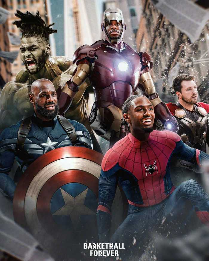 马克西中的NBA复联五人组!蜘蛛侠——他自己;钢铁侠——亚历山大;浩克——以赛亚-斯图尔特;美国队长——詹姆斯;雷神索尔——东契奇。