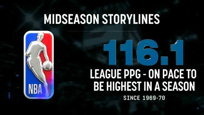 虎扑01月17日讯 本赛季截至目前,联盟场均得分116.1分,预计将创1969-70赛季以来单季新高。